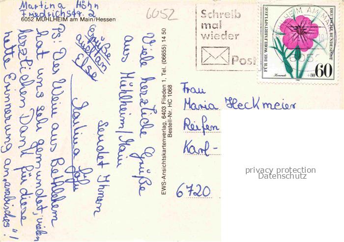 Muehlheim Main Offenbach Hessen Offenbacher Strasse Ulmen Strasse Kirche Tulpenweg Hallenbad Hess Bereitschaftspolizei postalisch gelaufen Erhaltung siehe scans [WerneD78] alte Postkarte Wern Katcode 11110006438008