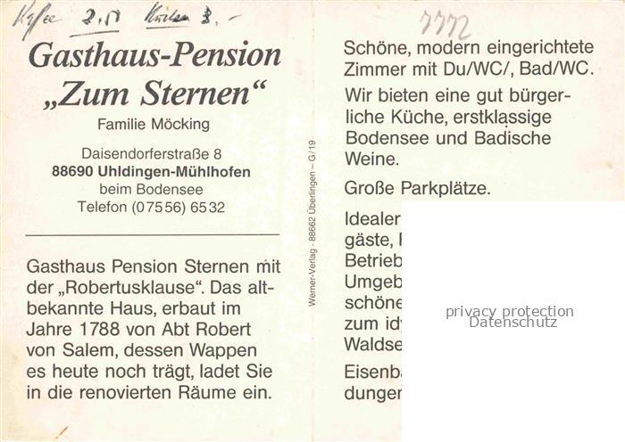 74104136 Muehlhofen Uhldingen-Muehlhofen Gasthaus Pension zum Sternen Restaurant Fremdenzimmer postalisch nicht gelaufen Werbekarte (keine Postkarte) Erhaltung siehe scans [FriedD77] Werbekarte (keine Postkarte) Frie Katcode 11110008435066