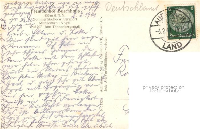 43349701 alte Postkarte Muehlleiten Vogtland Fremdenhof Buschhaus Winterlandschaft postalisch gelaufen Erhaltung siehe scans [FriedD77] KatCode: 11110014178250