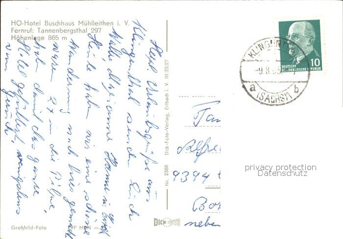 72135307 alte Postkarte Muehlleithen Klingenthal HO Hotel Buschhaus postalisch gelaufen Erhaltung siehe scans KatCode: 11110014178250