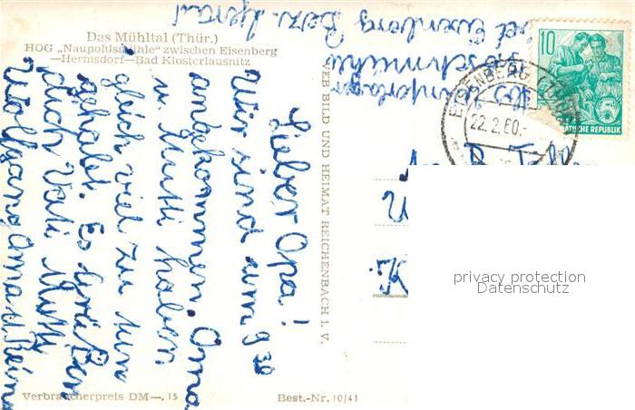 72937614 alte Postkarte Muehltal Thueringen HOG Naupoldismuehle postalisch gelaufen Erhaltung siehe scans [NatalD47] KatCode: 11110016051000