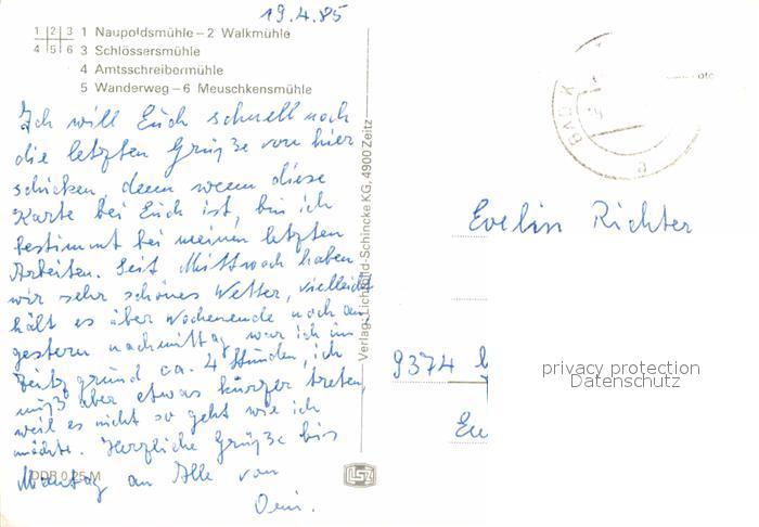 72727398 alte Postkarte Muehltal Thueringen Naupoldsmuehle Waldmuehle Schloessersmuehle Amtsschreibermuehle Wanderweg Meuschkensmuehle postalisch gelaufen Erhaltung siehe scans [FriedD77] KatCode: 11110016051000