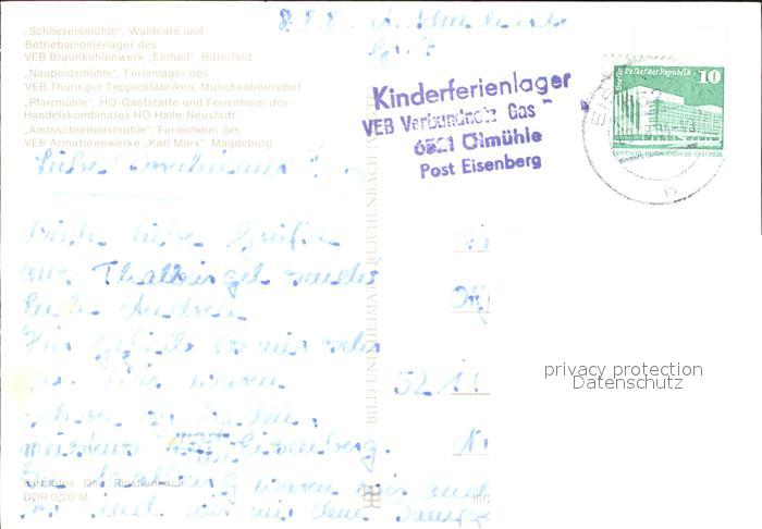 71946726 alte Postkarte Muehltal Thueringen Scoessersmuehle Waldcafe Bitterfeld Naupoldsmuehle Muenchenbernsdorf Pfarrmuehle Halle Neustadt Amtsschreibermuehle Magdeburg postalisch gelaufen Erhaltung siehe scans KatCode: 11110016051000