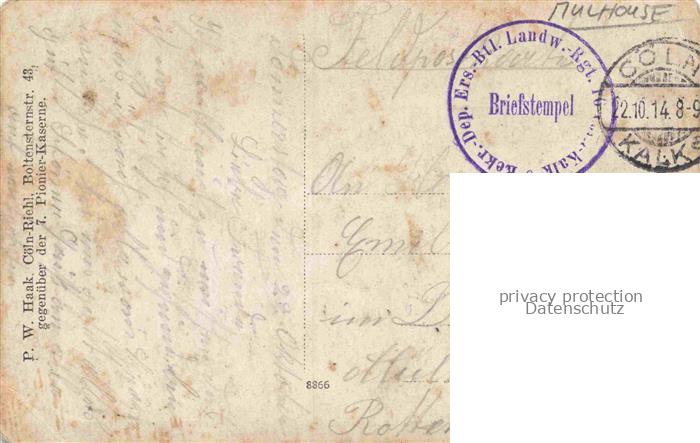 14121332 Muelhausen Elsass Muelhausener Landsturm Kameraden Koeln-Kalk Kriegsjahr 1914 Feldpost postalisch gelaufen Erhaltung siehe scans [FriedD77] carte postale Frie Katcode 11170068468224