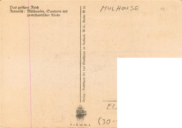 13899569 Muelhausen Elsass Sauturm mit protestantischer Kirche Zeichnung postalisch nicht gelaufen Erhaltung siehe scans [WerneD78] Wern Katcode 11170068468224