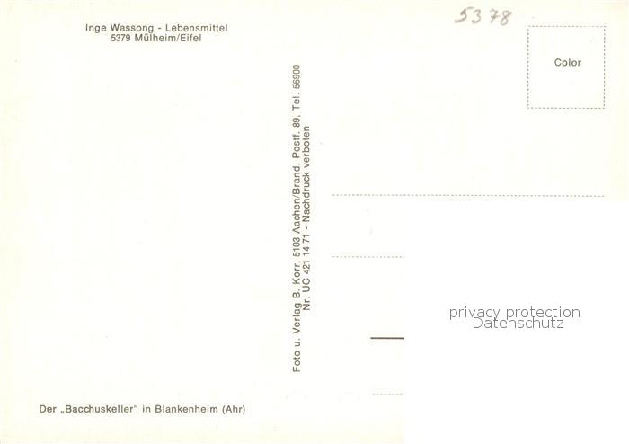 73871055 Muelheim Blankenheim Bacchus Keller postalisch nicht gelaufen Erhaltung siehe scans [WerneD78] KatCode: 11110005366008