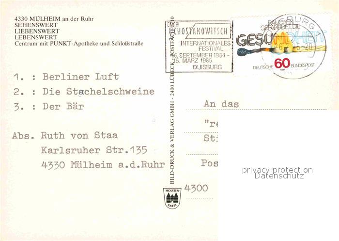 72750570 alte Postkarte Muelheim Ruhr Centrum mit Punkt-Apotheke und Schlossstrasse postalisch gelaufen Erhaltung siehe scans [LiesaD40] KatCode: 11110005117000