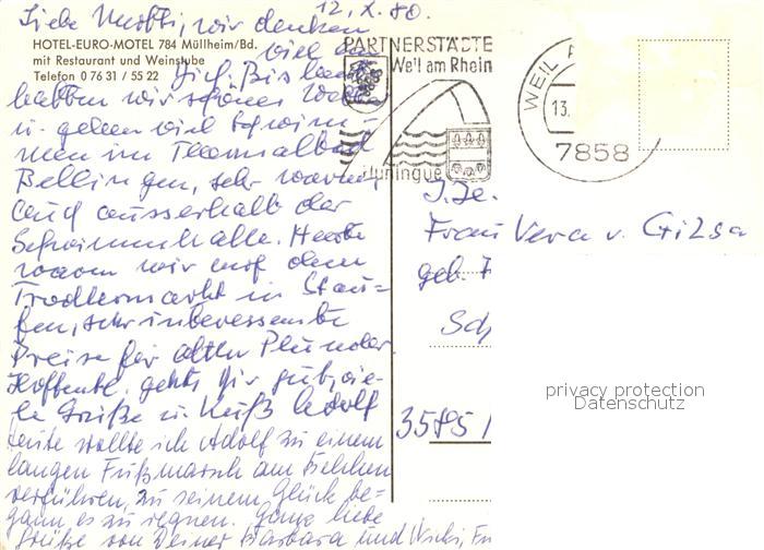 73649072 alte Postkarte Muellheim Baden Hotel Euro-Motel Gartenterrasse postalisch gelaufen Erhaltung siehe scans [FriedD77] KatCode: 11110008315074