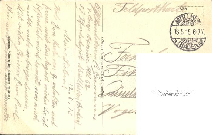 31849565 alte Postkarte Muellheim Baden Marktplatz Brunnen Apotheke postalisch gelaufen Feldpost Erhaltung siehe scans KatCode: 11110008315074