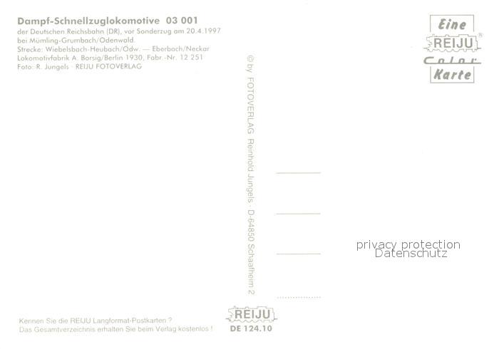 73177382 Muemling-Grumbach Dampf Schnellzuglokomotive 03 001 der Deutschen Reichsbahn postalisch nicht gelaufen Erhaltung siehe scans [FriedD77] KatCode: 11110006437009