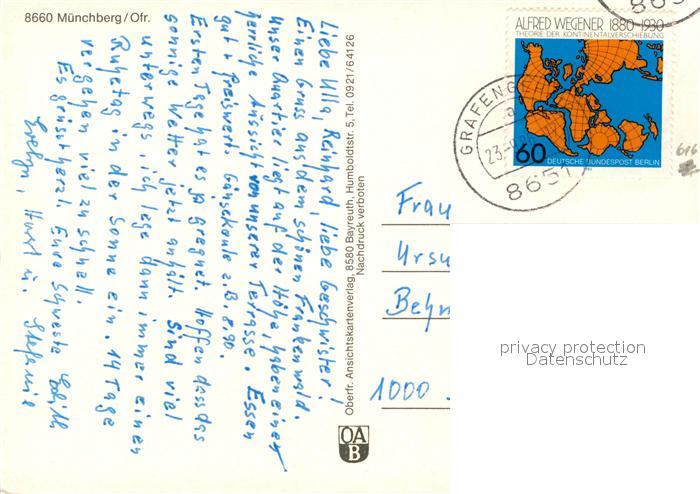 73574275 alte Postkarte Muenchberg Oberfranken Ortsansicht mit Kirche Freibad Landschaftspanorama Fichtelgebirge Wappen postalisch gelaufen Erhaltung siehe scans [FriedD77] KatCode: 11110009475154