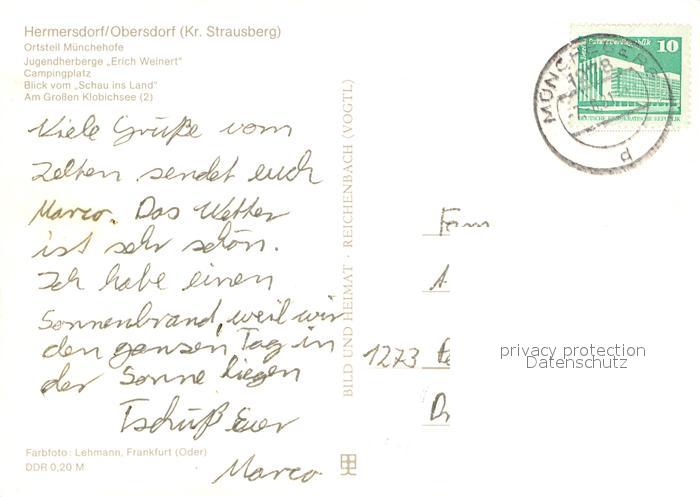 73652388 alte Postkarte Muenchehofe Obersdorf Jugendherberge Erich Weinert Campingplatz Blick vom Schau ins Land Grosser Klobichsee postalisch gelaufen Erhaltung siehe scans [FriedD77] KatCode: 11110012064317