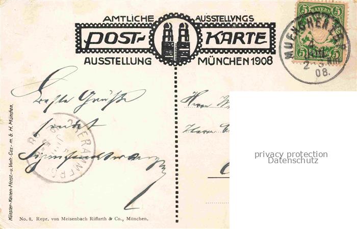 74008933 Muenchen Bayern Bierbrauerei Getraenkewerbung Amtliche Postkarte Ausstellung 1908 postalisch gelaufen Erhaltung siehe scans [FriedD77] alte Postkarte Frie Katcode 11110009162000
