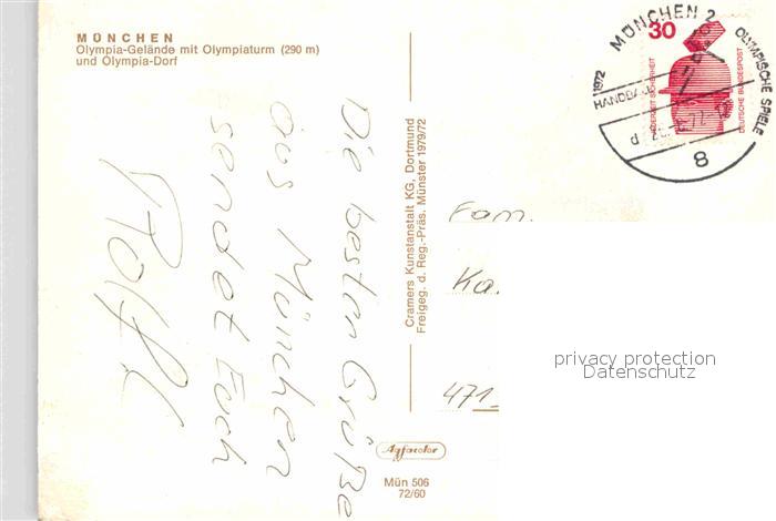 72814107 alte Postkarte Muenchen Bayern Fliegeraufnahme Olympia-Genlaende mit Olympiaturm postalisch gelaufen Erhaltung siehe scans [LiesaD40] KatCode: 11110009162000