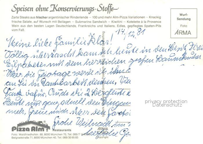 73741565 Muenchen Bayern Gaststaette Pizza Alm postalisch nicht gelaufen Erhaltung siehe scans [FriedD77] Frie Katcode 11110009162000