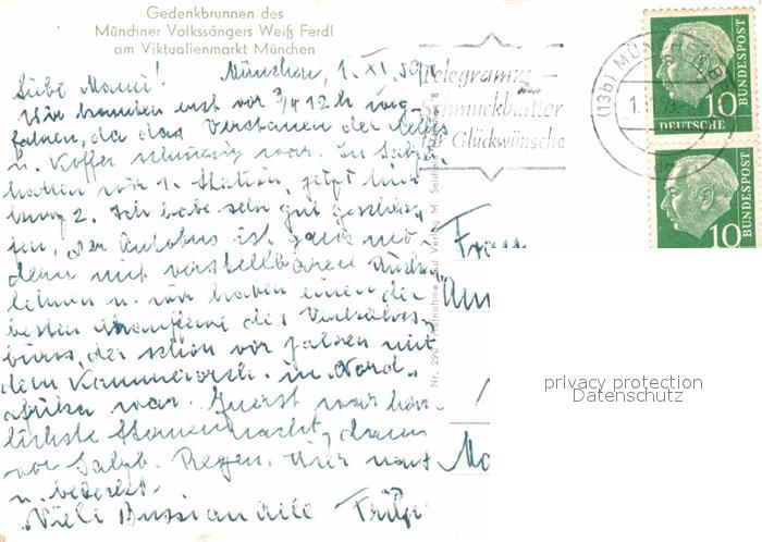 72793328 alte Postkarte Muenchen Bayern Gedenkbrunnen Fredl Weiss postalisch gelaufen Erhaltung siehe scans [AndreD76] KatCode: 11110009162000