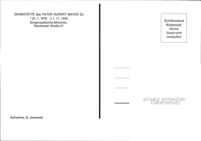 71976485 Muenchen Bayern Grabstaette Pater Rupert Mayer SJ Buergersaalkirche postalisch nicht gelaufen Erhaltung siehe scans KatCode: 11110009162000