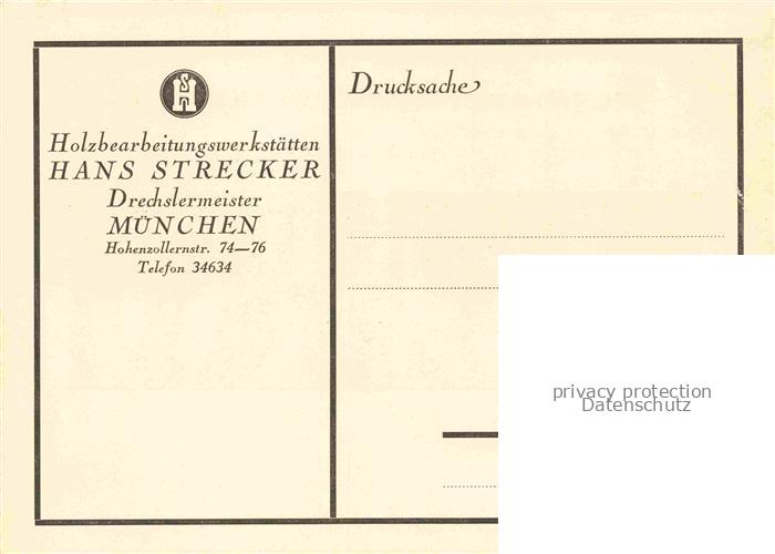 MueNCHEN Bayern Holzbearbeitungswerkstaetten Hans Strecker Steinhauer Schlegel postalisch nicht gelaufen Erhaltung siehe scans [WerneD78] Wern Katcode 11110009162000