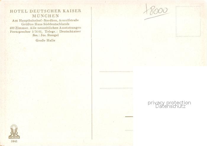 42933911 Muenchen Bayern Hotel Deutscher Kaiser Grosse Halle postalisch nicht gelaufen Erhaltung siehe scans [KathaD81] KatCode: 11110009162000
