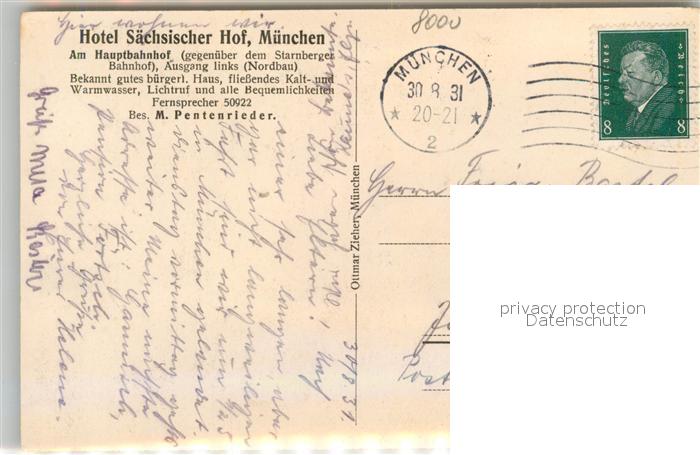 43183638 Muenchen Bayern Hotel Saechsischer Hof postalisch gelaufen Erhaltung siehe scans [FriedD77] alte Postkarte Frie Katcode 11110009162000