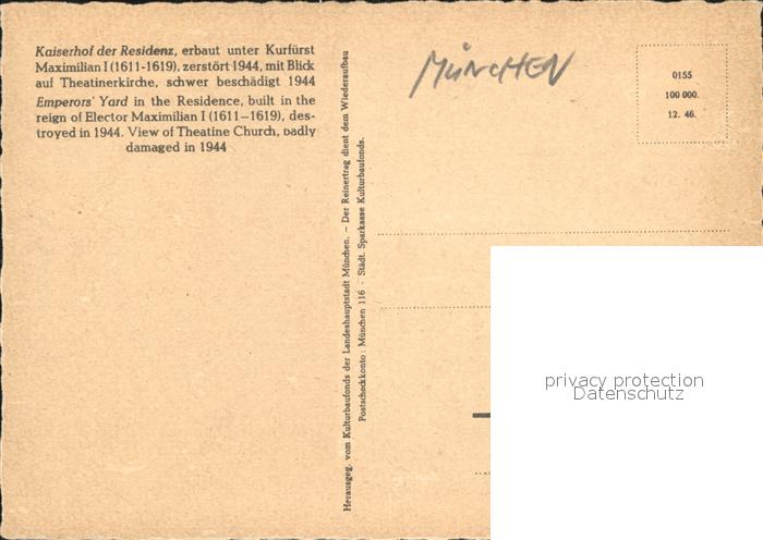 72149557 Muenchen Bayern Kaiserhof der Residenz zerstoert 1944 mit Theatinerkirche Kuenstlerkarte postalisch nicht gelaufen Erhaltung siehe scans KatCode: 11110009162000