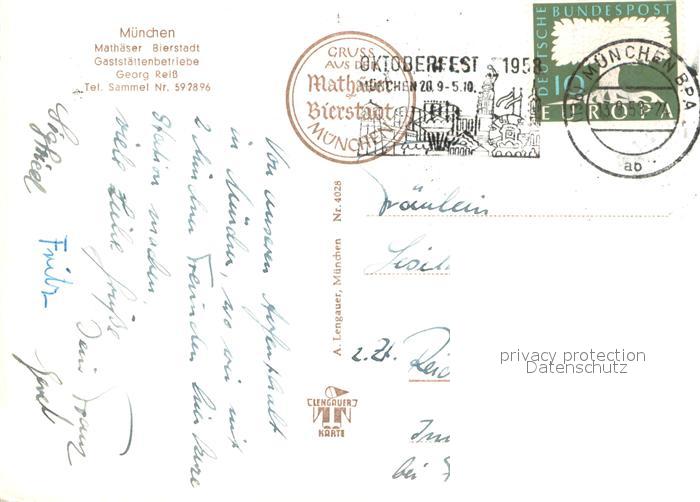 73669648 Muenchen Bayern Mathaeser Bierstadt Gaststaettenbetriebe Reiss postalisch gelaufen Erhaltung siehe scans [FriedD77] alte Postkarte Frie Katcode 11110009162000