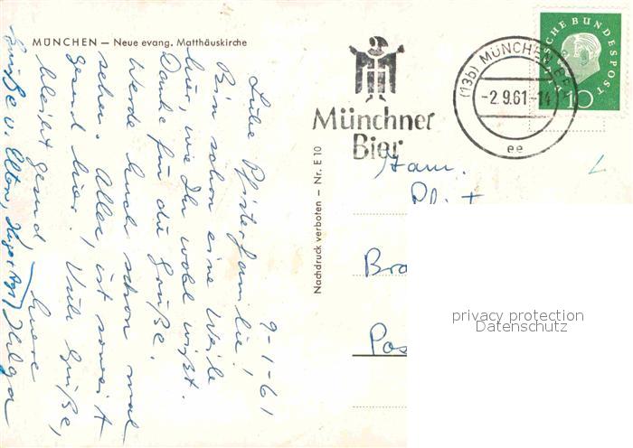 72697706 alte Postkarte Muenchen Bayern Neue evangelische Matthaeuskirche Springbrunnen postalisch gelaufen Erhaltung siehe scans [FriedD77] KatCode: 11110009162000