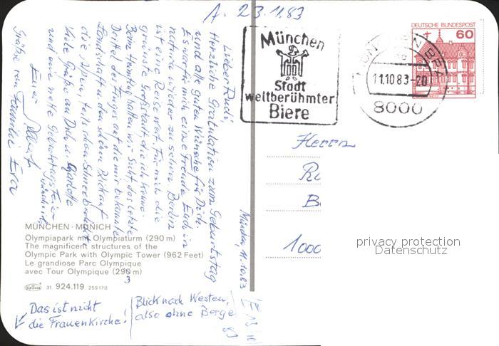 72137899 alte Postkarte Muenchen Bayern Olympiapark mit Olympiaturm postalisch gelaufen Erhaltung siehe scans KatCode: 11110009162000