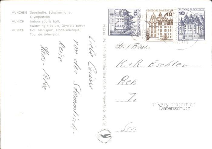 72308658 alte Postkarte Muenchen Bayern Olympiaturm Sporthalle und Schwimmhalle postalisch gelaufen Erhaltung siehe scans KatCode: 11110009162000
