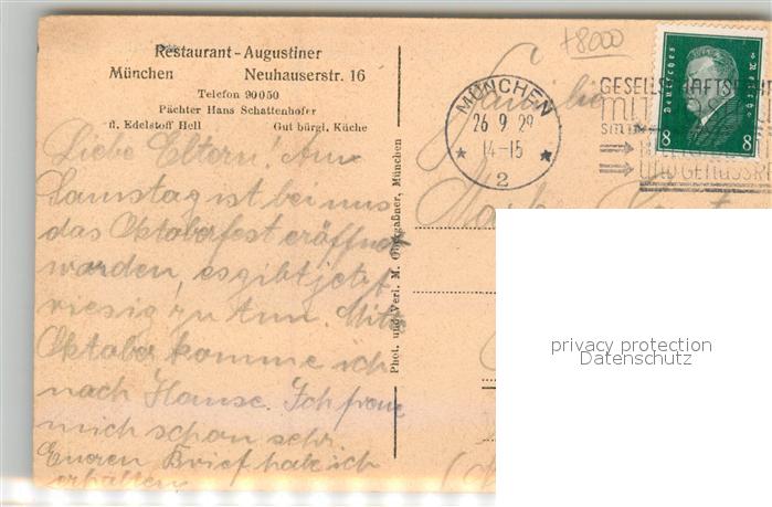 43149913 Muenchen Bayern Restaurant Augustiner postalisch gelaufen Erhaltung siehe scans [KathaD81] alte Postkarte Kath Katcode 11110009162000