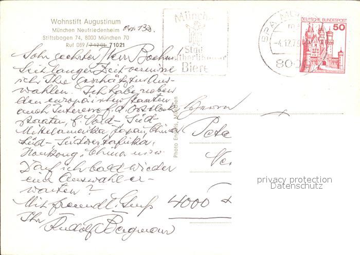 72135120 alte Postkarte Muenchen Bayern Wohnstift Augustinum postalisch gelaufen Erhaltung siehe scans KatCode: 11110009162000