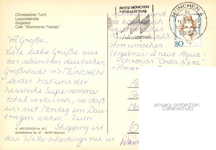 73068503 alte Postkarte Muenchen Chinesischer Turm Leopoldstrasse Siegestor Cafe Muenchener Freiheit postalisch gelaufen Erhaltung siehe scans [WerneD78] KatCode: 11110009162000