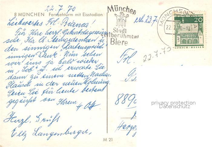 73073933 alte Postkarte Muenchen Fernsehturm mit Eisstadion postalisch gelaufen Erhaltung siehe scans [WerneD78] KatCode: 11110009162000