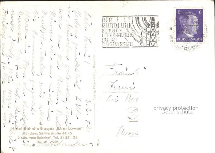 32186211 alte Postkarte Muenchen Hotel Bahnhofhospiz Drei Loewen postalisch gelaufen Erhaltung siehe scans KatCode: 11110009162000