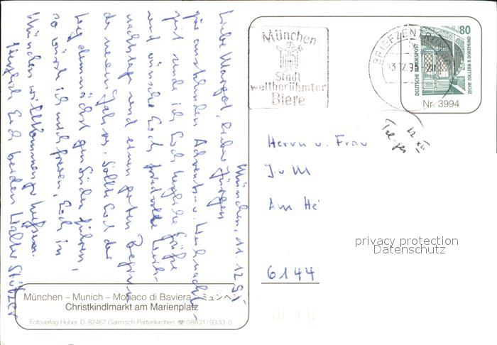 alte Postkarte Muenchen Marienplatz Christkindlmarkt postalisch gelaufen Erhaltung siehe scans