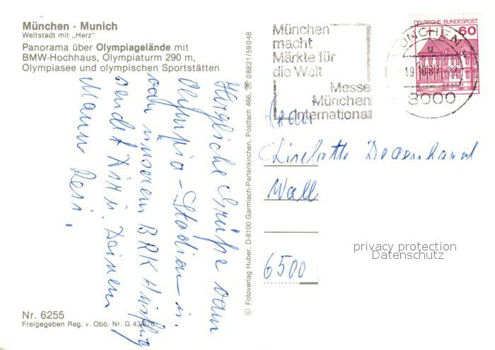 73230389 alte Postkarte Muenchen Olympiagelaende BMW Hochhaus Olympiaturm See Sportstaetten Fliegeraufnahme postalisch gelaufen Erhaltung siehe scans [FriedD77] KatCode: 11110009162000