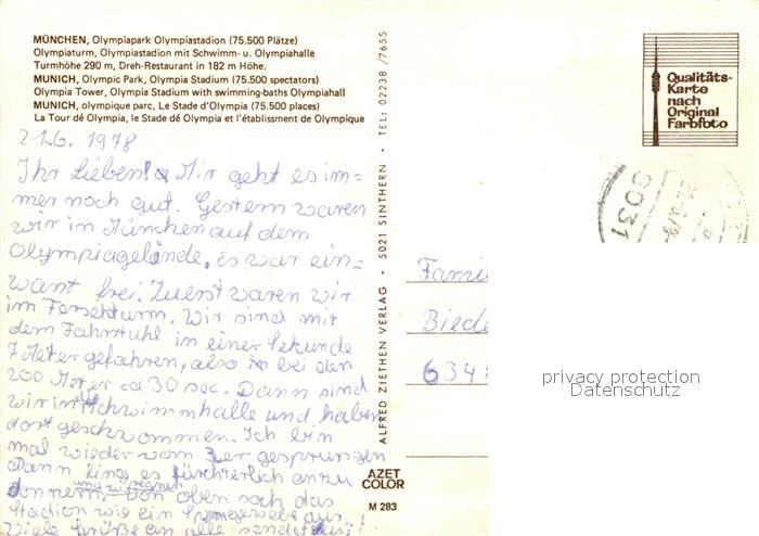 73184178 alte Postkarte Muenchen Olympiapark Olympiastadion Olympiaturm postalisch gelaufen Erhaltung siehe scans [PaolaD17] KatCode: 11110009162000