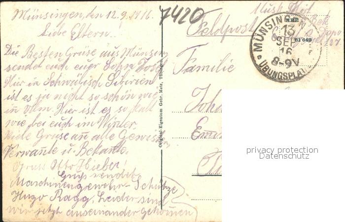 31722396 alte Postkarte Muensingen Truppenuebungsplatz postalisch gelaufen Feldpost Erhaltung siehe scans KatCode: 11110008415053