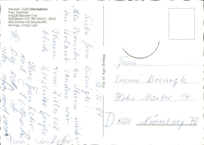 71484272 alte Postkarte Muenster Tirol Pension Cafe Zillertalblick postalisch gelaufen Erhaltung siehe scans KatCode: 11390335070517