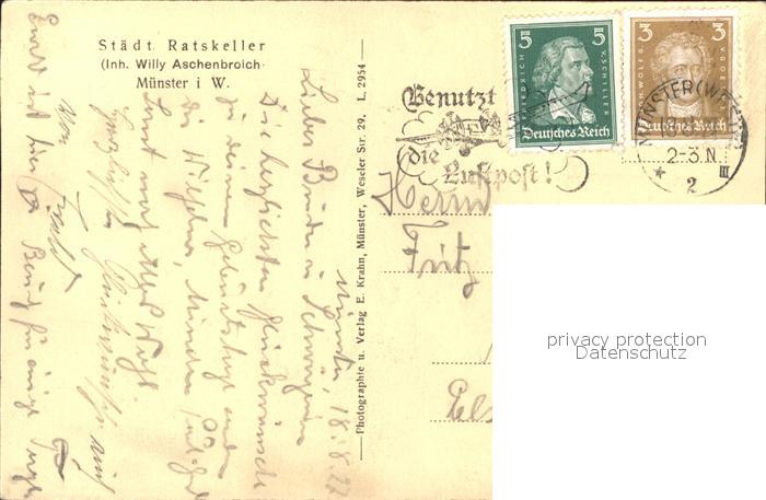 31714090 alte Postkarte Muenster Westfalen Biertonne im Staedtischen Ratskeller Willy Aschenbroich postalisch gelaufen Erhaltung siehe scans KatCode: 11110005515000
