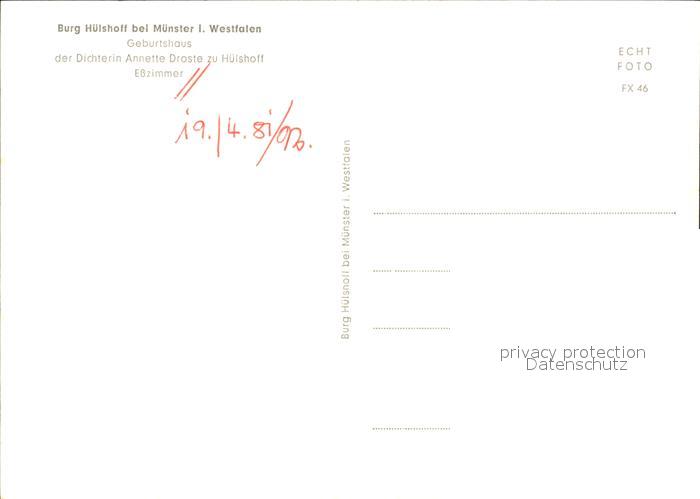 72565648 Muenster Westfalen Burg Huelshoff Geburtshaus der Dichterin Annette Droste zu Huelshoff Esszimmer postalisch nicht gelaufen Erhaltung siehe scans [LiesaD40] KatCode: 11110005515000