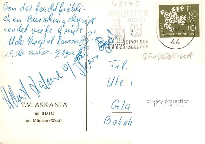 73854798 Muenster Westfalen Burschenschaft Askania Wappen postalisch gelaufen Erhaltung siehe scans [WerneD78] alte Postkarte Wern Katcode 11110005515000