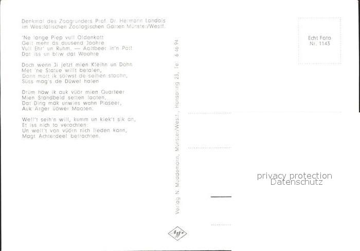 72177565 Muenster Westfalen Denkmal Zoogruenders Prof Dr Hermann Landois postalisch nicht gelaufen Erhaltung siehe scans KatCode: 11110005515000