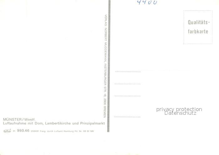 73321279 Muenster Westfalen Dom Lambertikirche Prinzipalmarkt Fliegeraufnahme postalisch nicht gelaufen Erhaltung siehe scans [FriedD77] KatCode: 11110005515000