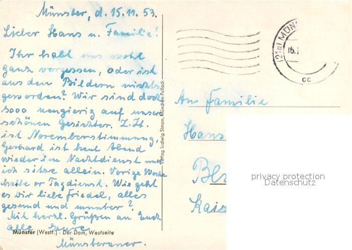 73720345 alte Postkarte Muenster Westfalen Dom Westseite postalisch gelaufen Erhaltung siehe scans [FriedD77] KatCode: 11110005515000