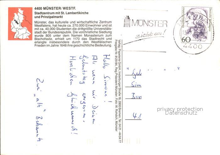 72255340 alte Postkarte Muenster Westfalen Fliegeraufnahme Altstadt mti Prinzipalmarkt und Lambertikirche postalisch gelaufen Erhaltung siehe scans KatCode: 11110005515000