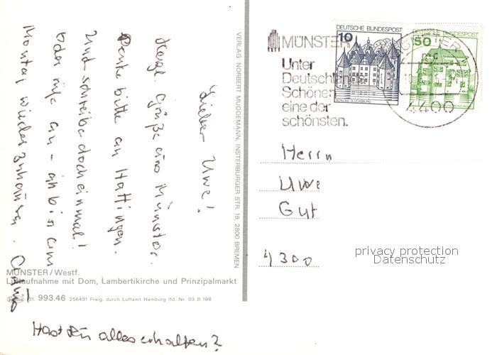 73034380 alte Postkarte Muenster Westfalen Fliegeraufnahme Dom Lambertikirche Prinzipalmarkt postalisch gelaufen Erhaltung siehe scans [PaolaD17] KatCode: 11110005515000