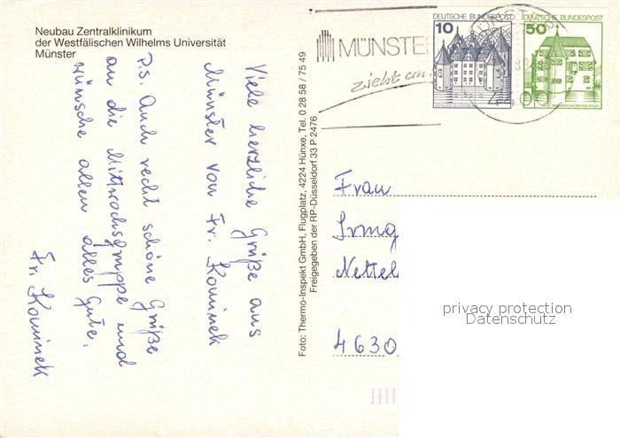 73129758 alte Postkarte Muenster Westfalen Fliegeraufnahme Neubau Zentralklinikum postalisch gelaufen Erhaltung siehe scans [NatalD47] KatCode: 11110005515000
