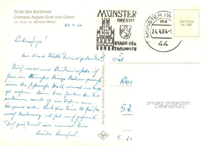 73805030 alte Postkarte Muenster Westfalen Grab des Kardinals Clemens August Graf von Galen im Dom zu Muenster postalisch gelaufen Erhaltung siehe scans [FriedD77] KatCode: 11110005515000