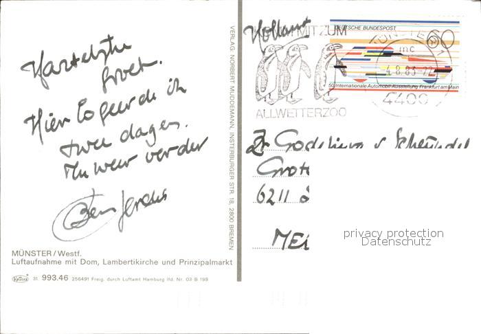 72464633 alte Postkarte Muenster Westfalen Luftaufnahme Dom Lambertikirche Prinzipalmarkt postalisch gelaufen Erhaltung siehe scans KatCode: 11110005515000